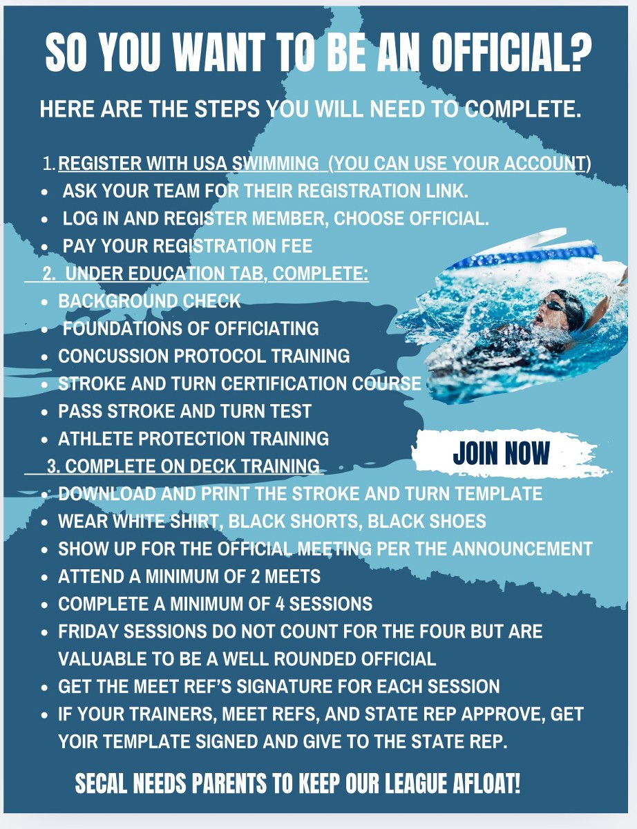 Parents we need more officials to keep our program going for our swimmers. The team will for your registration and background check, as well as one of your child's meet fees are paid if you officiate at the meet they are swimming at. Also, this is a reminder the team will pay the penalty up to $200 (8 sessions x$25) that we do not have an official and after that the team will be charging this back to each family if your child swims a session that our team does not have an official, this was voted on and approved at the February parent meeting.