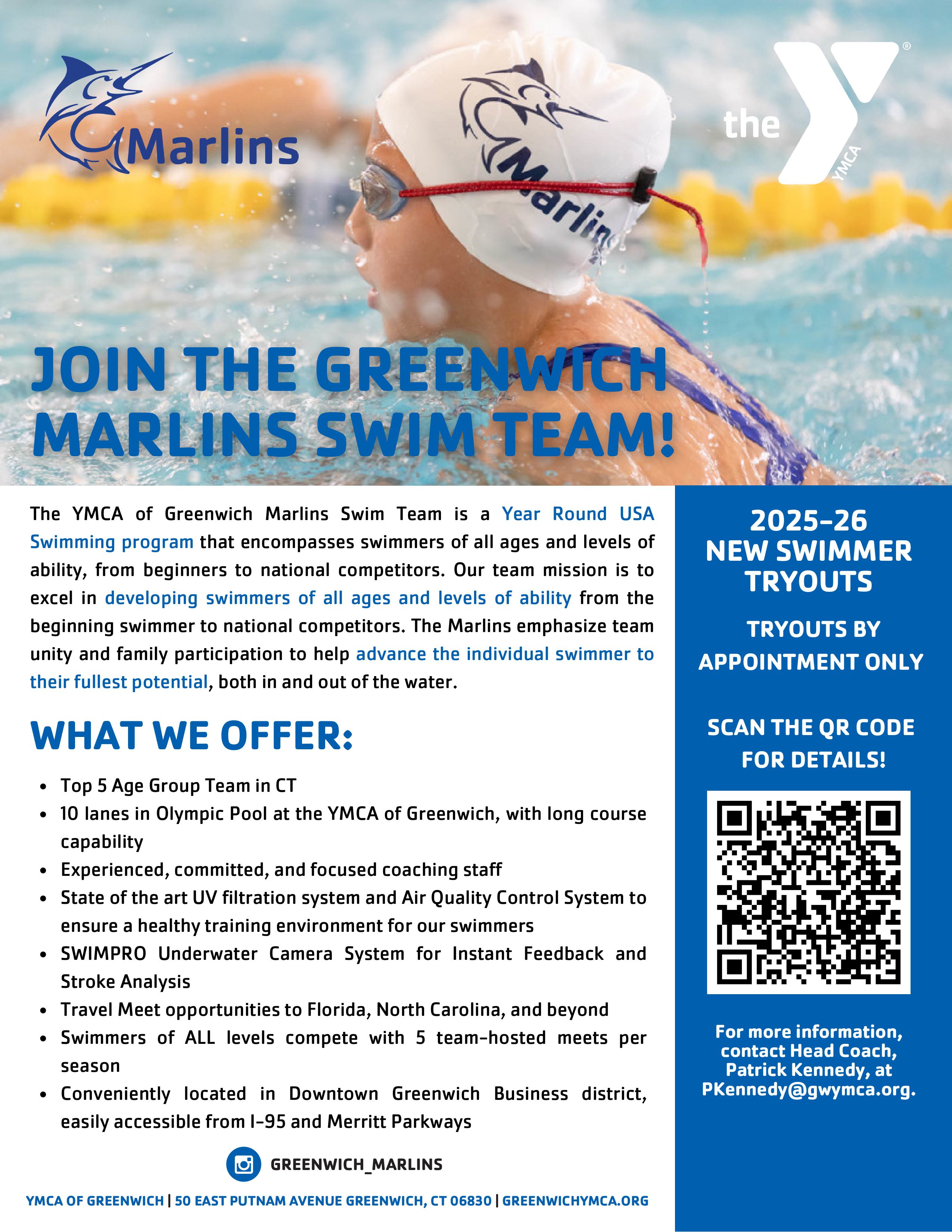Tryouts by appointment only at the Greenwich YMCA Olympic Pool
