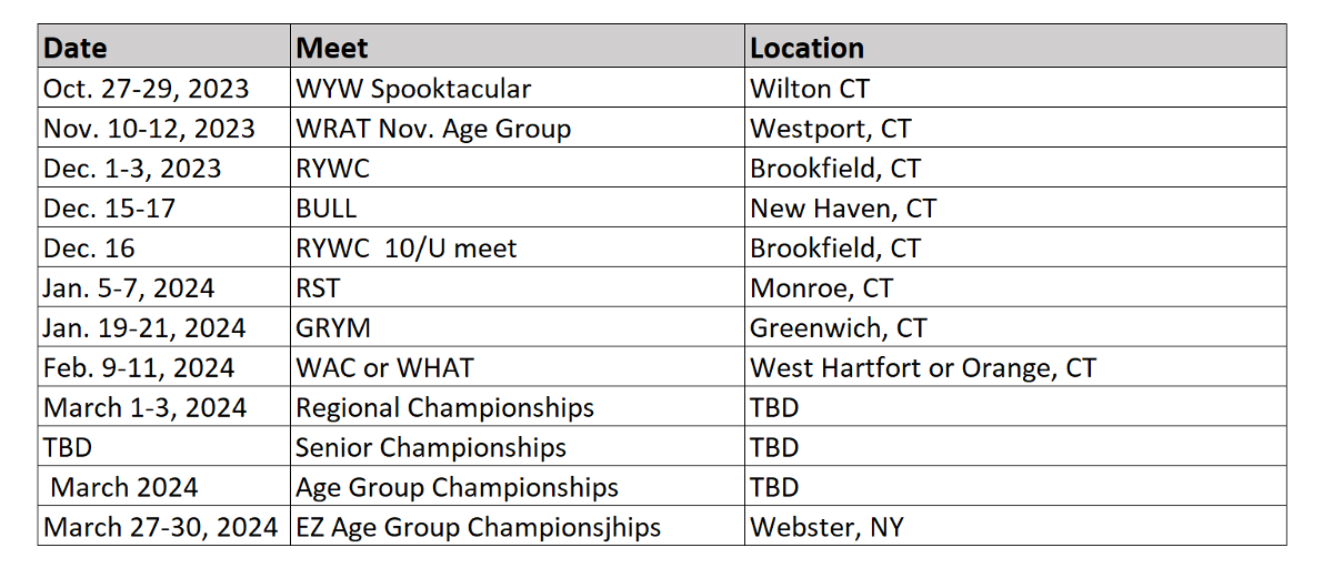 For early scheduling convenience, here is a rough plan of what weekends the Aquaflyers are planning to participare in swim meets: