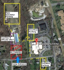 On the day of the event ONLY coaches and officials may park along the pool fence. Primary spectator parking will be in the grass field behind the basketball court. No one is to park on the grass along the road before the pool. Overflow parking will be in the lower lot behind the YMCA and directly across the street from the entrance of YMCA at CCA. Parking areas are outlined as well as walking routes in the attached map.