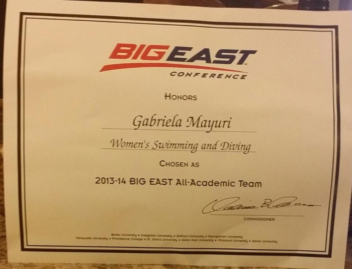 - Congratulations to Providence Friar Swimming member Gabriela Mayuri for being named to the 2013-2014 BIG EAST All-Academic Team. A picture of her certificate is attached below.