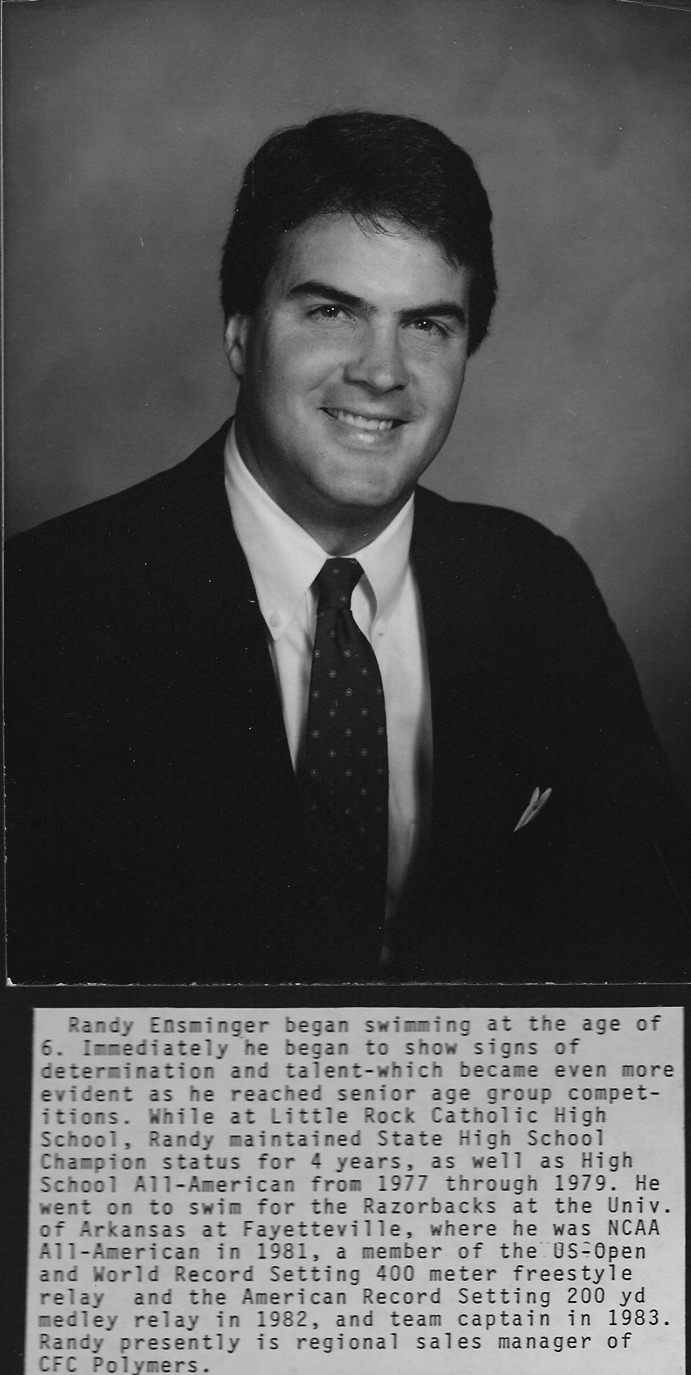 Randy Ensminger began swimming at the age of 6. Immediately he began to show signs of determination and talent-which became even more evident as the reached senior age group competition. While at Little Rock Catholic High School, Randy maintained State High School Champion status for 4 year, as well as High School All-American from 1977 through 1979. He went on to swim for the Razorbacks at the University of Arkansas at Fayetteville, where he was NCAA All-American in 1981, a member of the US-Open and World Record Setting 400 meter freestyle relay and the American Record Setting 200 yd medley relay in 1982, and team captain in 1983. Randy presently is regional sales manager of CFC Polymers.