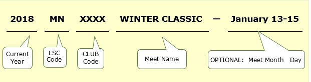 Required ProcessesForms All forms you need are available on the DOCUMENTS page, in the Meet Management section. (Note: All forms have been updated. If you see anything incorrect or have questions, please contact the MNSI Operations Manager.) Important: when naming your meet, be sure to |