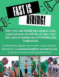 7/7/2025 FAST currently has open coaching positions for our Age Group and Senior sides of the program. Part-time availability with potential of full-time based on experience and team needs. Please inquire with Head Coach Andrew Westerman at [email protected] with interest and a resume with coaching experience.