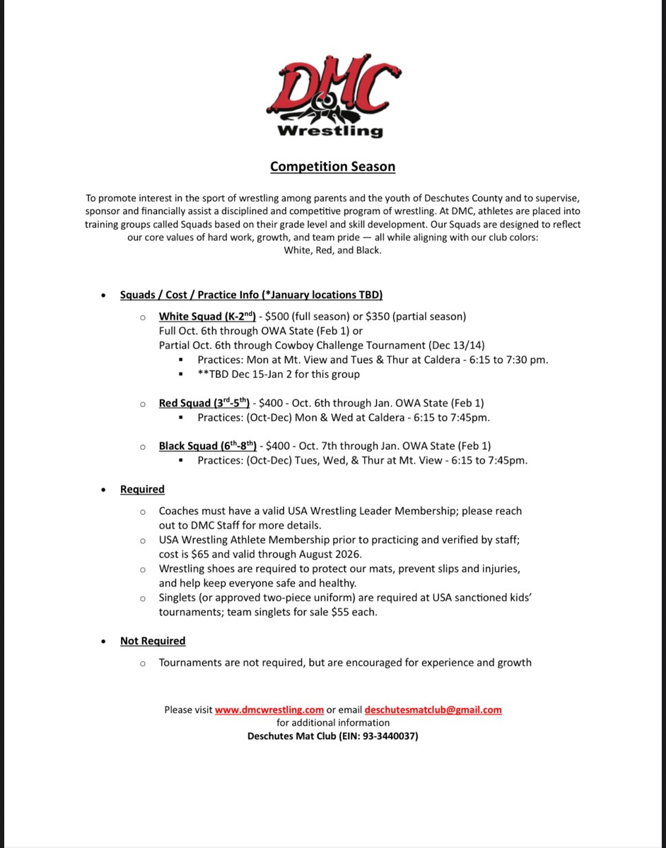 Our 2025 DMC Competition Season flyer is now available! Check it out for key dates, events, and info for the year ahead. Don’t forget to register now at www.dmcwrestling.com to secure your spot for the season.