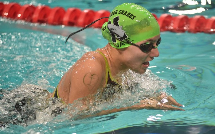 Naples' Ava Epperly competes in the girls 13-to-14-year-old 100-meter breaststroke race on Saturday during the European Forces Swim League Short Distance Championships at the Pieter van den Hoogenband Zwemstadion at the Zwemcentrum de Tongelreep. (Matt Wagner/Stars and Stripes)