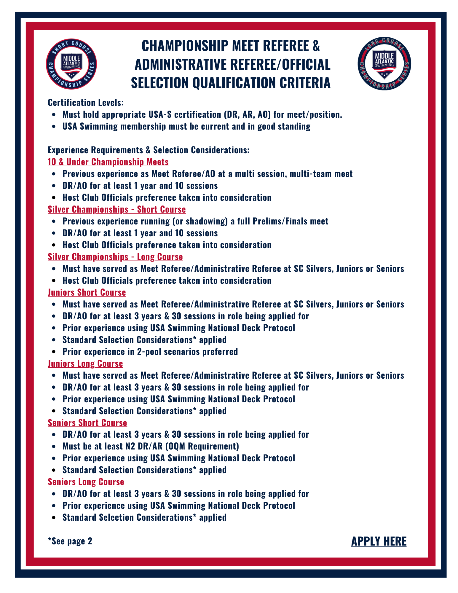Middle Atlantic Swimming has announced updated guidelines, found below, for the selection and qualification of officials for its championship meets. These standards emphasize experience, professionalism, and a commitment to excellence, ensuring the success of events at all competitive levels.