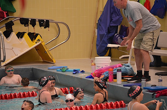 The young Hatters are excited about their sport and enjoy talking about it. They were giddy when they lined up to answer my questions. When practice started, they jumped right in with no complaints and started warming up. The young swimmers had overflowing energy, ready to learn new drills and swim fast at practice. When the swimmers didn’t know a drill, Coach Mike and Coach Kip took the time to describe them, demonstrating the technique until they understood.