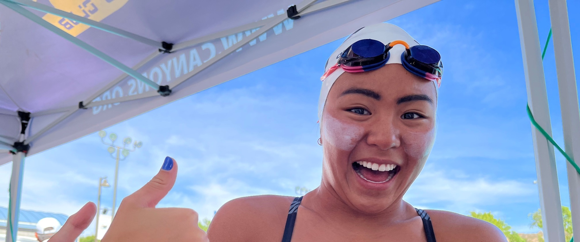 This morning Kailee Chow competed in her first Summer Junior Nationals, swimming the 200M Butterfly and finishing in 27th place. The meet features more than 1,000 swimmers from around the country and the competition is intense, but it's also made a bit easier with a big smile.