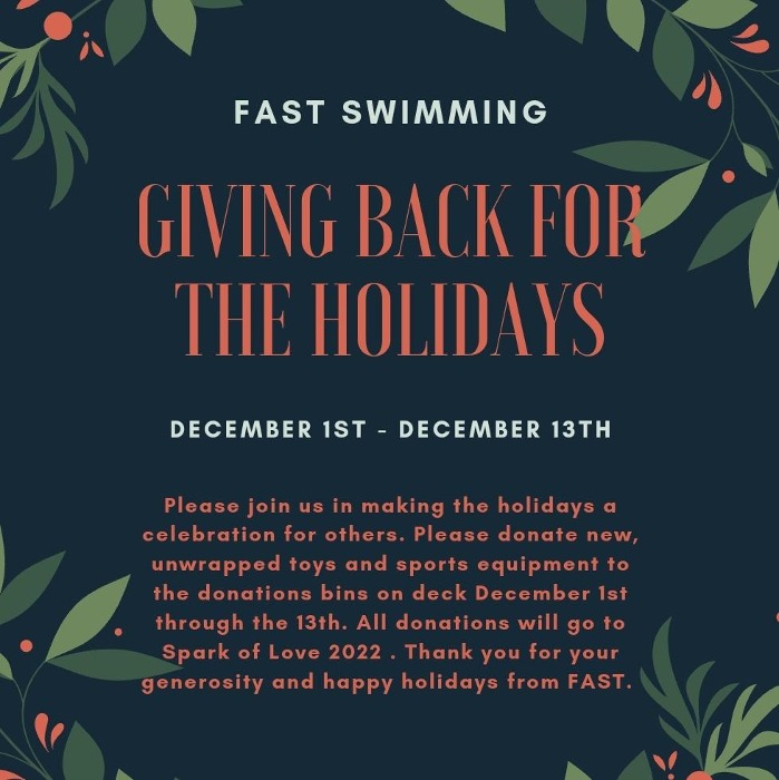 The FAST Holiday Toy Drive will begin tomorrow, December 1 and run through December 13. Please bring unwrapped toys and/or sports equipment to the Janet Evans Swim Complex when you come to practice.