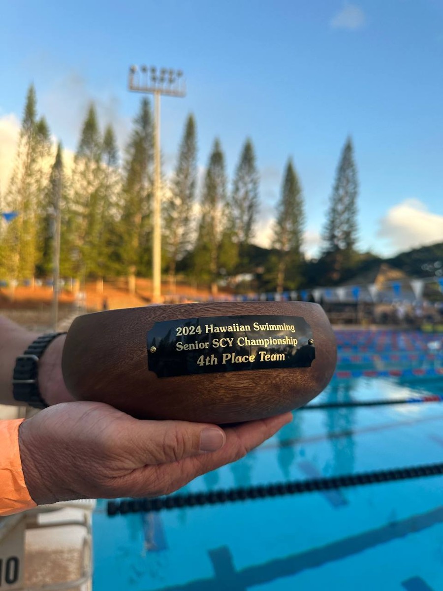 Waipahu, HI -- Fourteen Senior swimmers captured a 4th place overall finish at the 2024 Hawaii Senior Championships last weekend on Oahu. The group had a fantastic meet with 74 lifetime bests and 55 second swims. All 14 swimmers achieved multiple lifetime bests and earned second swims!