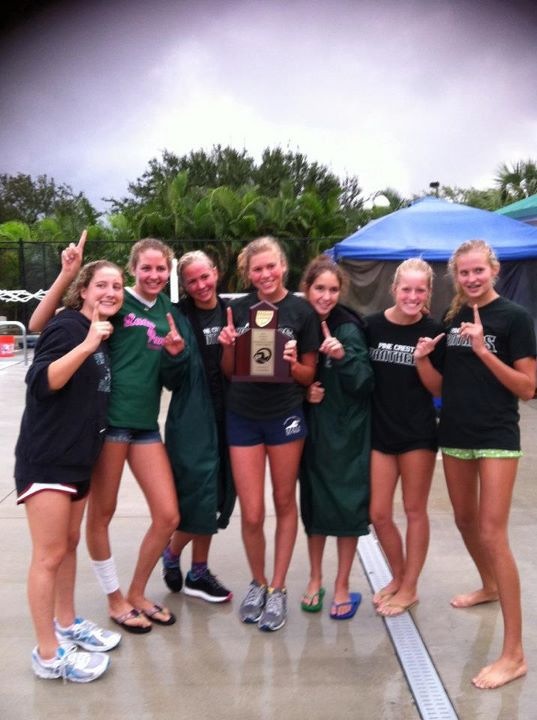 Then when we got to the meet that morning there was a coaches meeting with the meet refree who explained that FHSAA said if the weather was bad in the evening then the meet would be run and scored as a Time Final event. It was explained at the meeting that if that were to happen then the relay times and individual placings would be what was used for teams to advance to Regions. Pine Crest had planned to use some of the younger swimmers on the morning relays to give them experience in a Championship meet, but when we knew that if the meet were called due to weather, that the times done would be used to advance to Regions then our relays were changed to what was going to swim at night. Not all schools did this thinking they could rest their top swimmers in the morning and make changes at night. Well the meet was called due to weather and our team made sure their performance from the morning would advance them to Regions.