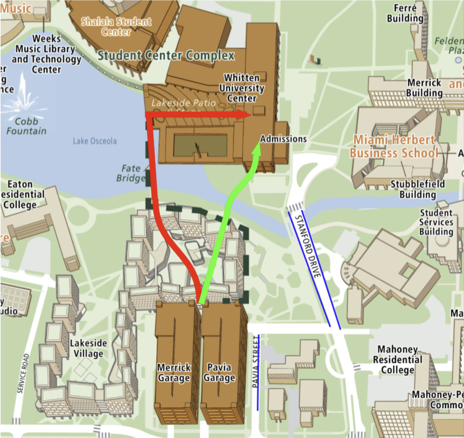 A Visitor’s lot is available as well. It is metered parking, the cost is $1 per hour, and the hours are from 9am to 10pm, excluding holidays and Sundays. When you stop at the guard shack on Stanford drive, ask for the code to the Visitor’s lot. You will need this code to get into the lot. After receiving the code and passing the guard shack, make the second left onto Geo C. Merrick. Follow this road straight and then around to the left. Just past the left bend in the road, turn left into the Visitor’s lot. Pavia Garage is also open for parking. You can purchase a parking pass at the guard shack when you drive in on Stanford Drive, or there is a machine inside the garage by the elevators. The cost is $1 per hour and they take credit cards and cash. After you turn onto Stanford Drive and pass the guard shack on your left, make the first left onto Levante. You will see Canterbury Preschool on your left. Continue driving then take the next right which is Pavia Road. The garage will now be on your left. The entrance is down that street on your left. The University does not ticket after 4pm in the garage.