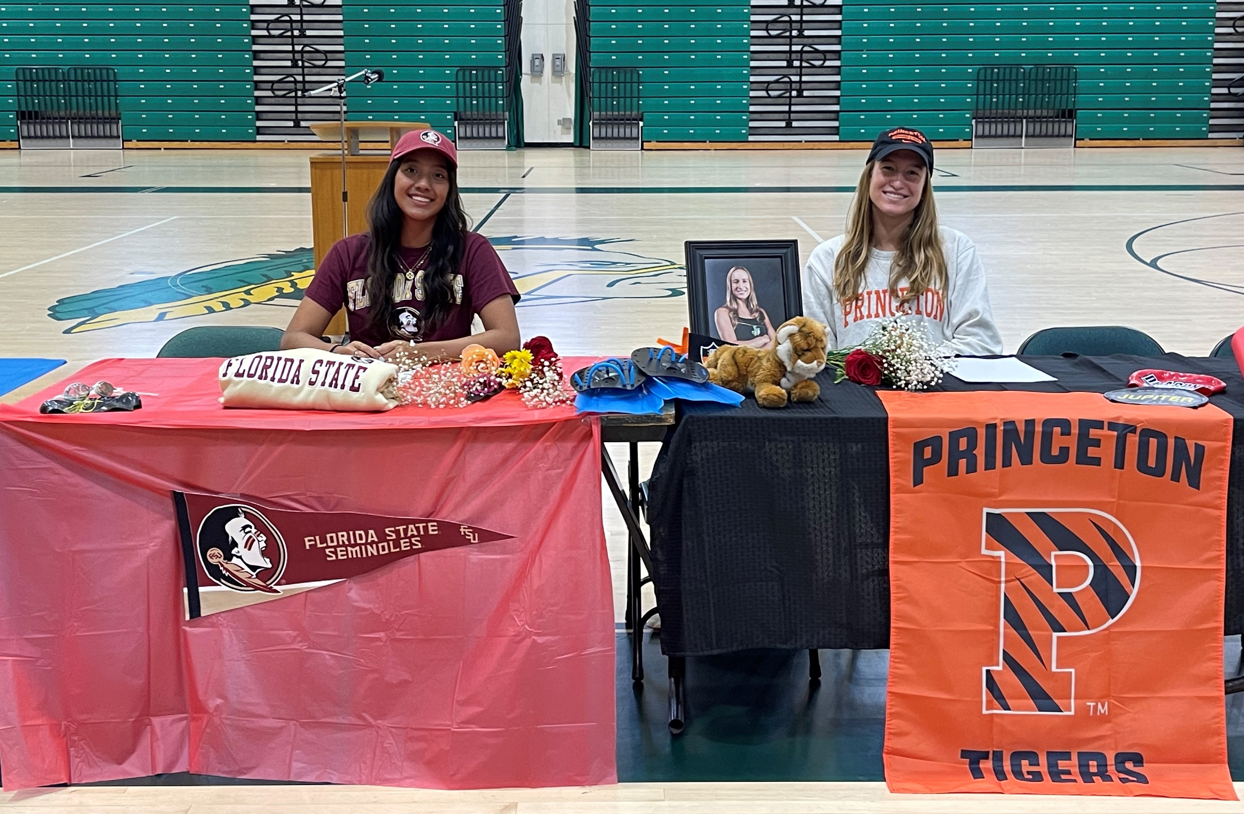 Kiara Caamano signing papers to swim for Florida State University and Heidi Smithwick signing papers to swim for Pinceton University at the Ceremony in Jupiter High School!