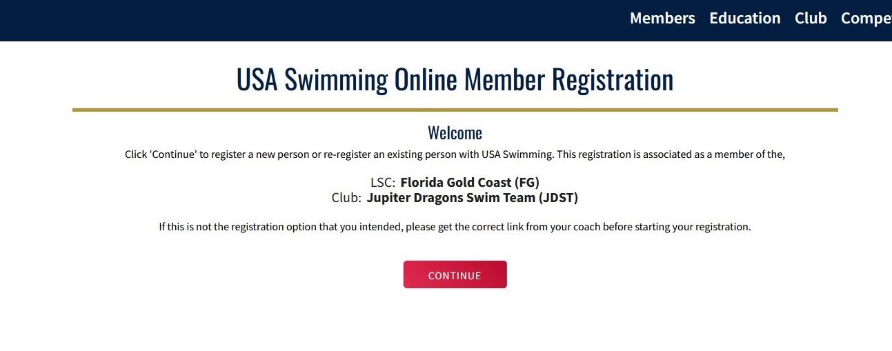 Scroll and Click on the rectangular button - Club Registration Link below which is unique to our Jupiter Dragons Swim Team for you to register either yourself (if you are an official), or your swimmer(s).