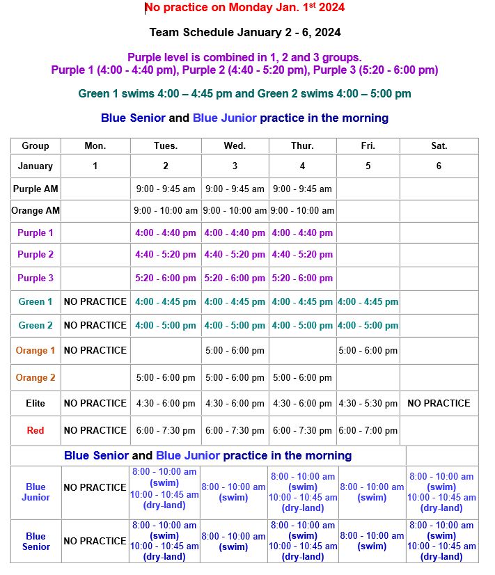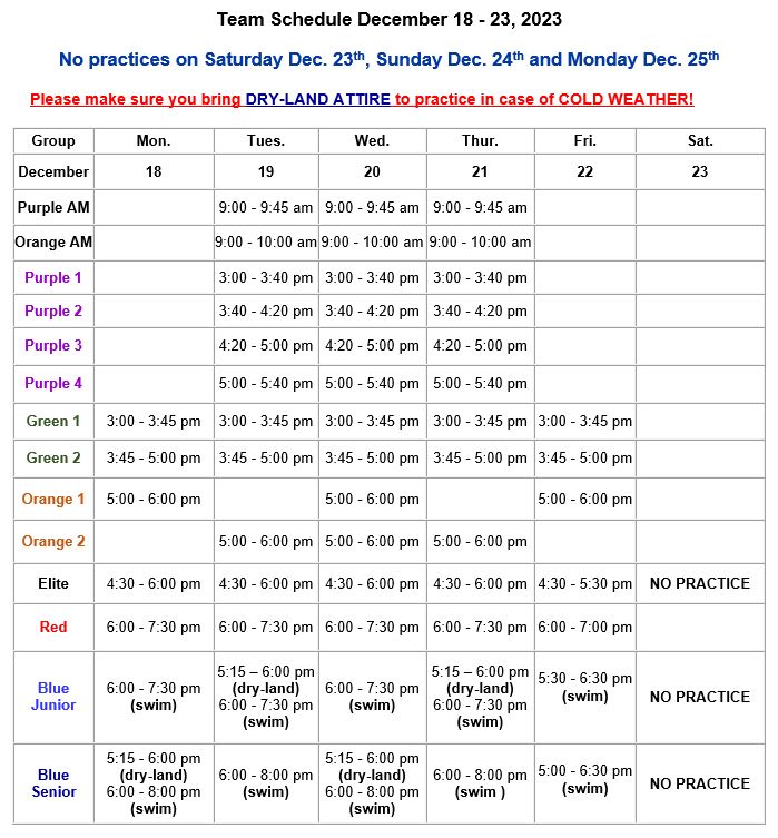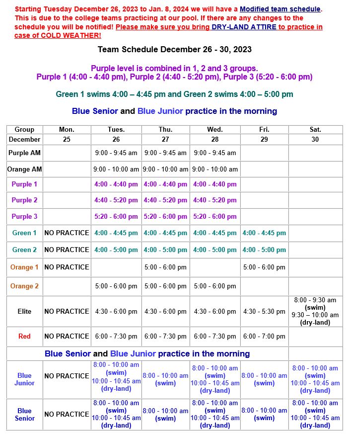 Starting Tuesday December 26, 2023 to Jan. 10, 2024 we will have a Modified team schedule. This is due to the college teams practicing at our pool.