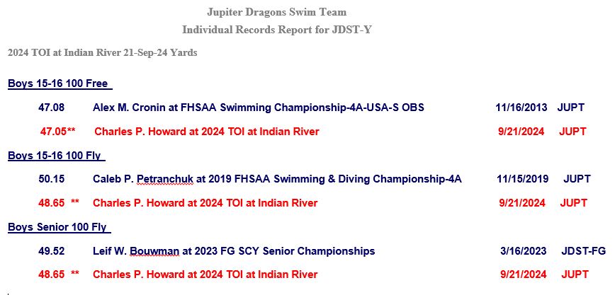 Buddy Howard breaking 3 Jupiter Dragons Swim Team Records and achieving Junior Nationals qualification time!
