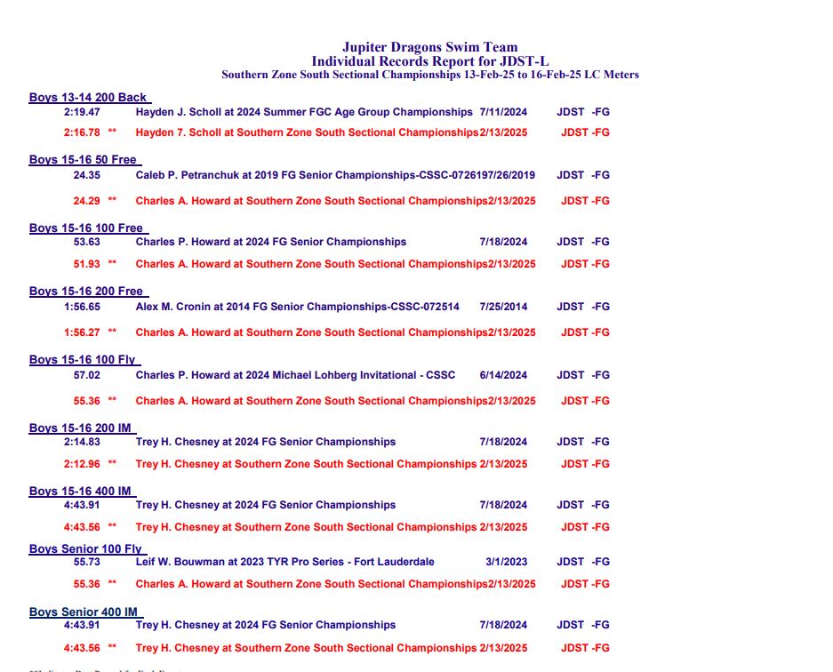 Congratulations to all 8 Jupiter Dragons swimmers for their exceptional performance at the Southern Zone Sectional Champs in Plantation February 13-16, 2025!