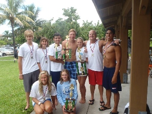 Jupiter Dragons swimmers dominated the Ocean Mile swim! Left to right: 1st row: Coach Sierra Groth, Amber Pearce, 2nd row standing: Maxwell Murasko, Rebecca Battles, Armand Choy, Alex Cronin, ,Chase Harris, Phil Harris and Esteban Sarmiento Right to left: Shelby Crookes and Hannah Thomas placed 1st and 2nd in 13-14 Girls. Congratulations to all!!!