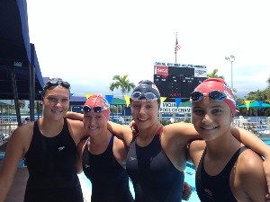Jupiter Dragons Girls 13-14 200 Medley Relay Team: Right to left: Francesca Choy, Cybele Jung, Sydney Groth and Shayne Sipowski smashed the Team Record and Florida Gold Coast Open Record at time trials during Senior Champs. They swam a time of 2:06.53 which is 1 second faster than the previous record and 0.72 faster than the FGC Open record. Way to go Girls!!!