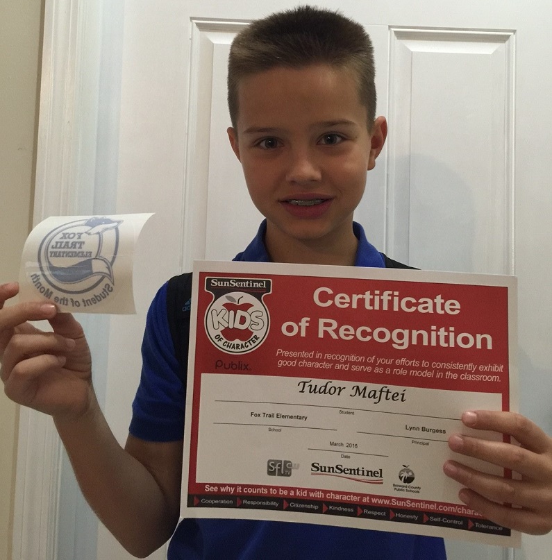 Congratulations to Tudor Maftei for being awarded Student of the Month for March at his school for character. He received the certificate in recognition for his efforts to consistently exhibit good character and serve as a role model in the classroom.