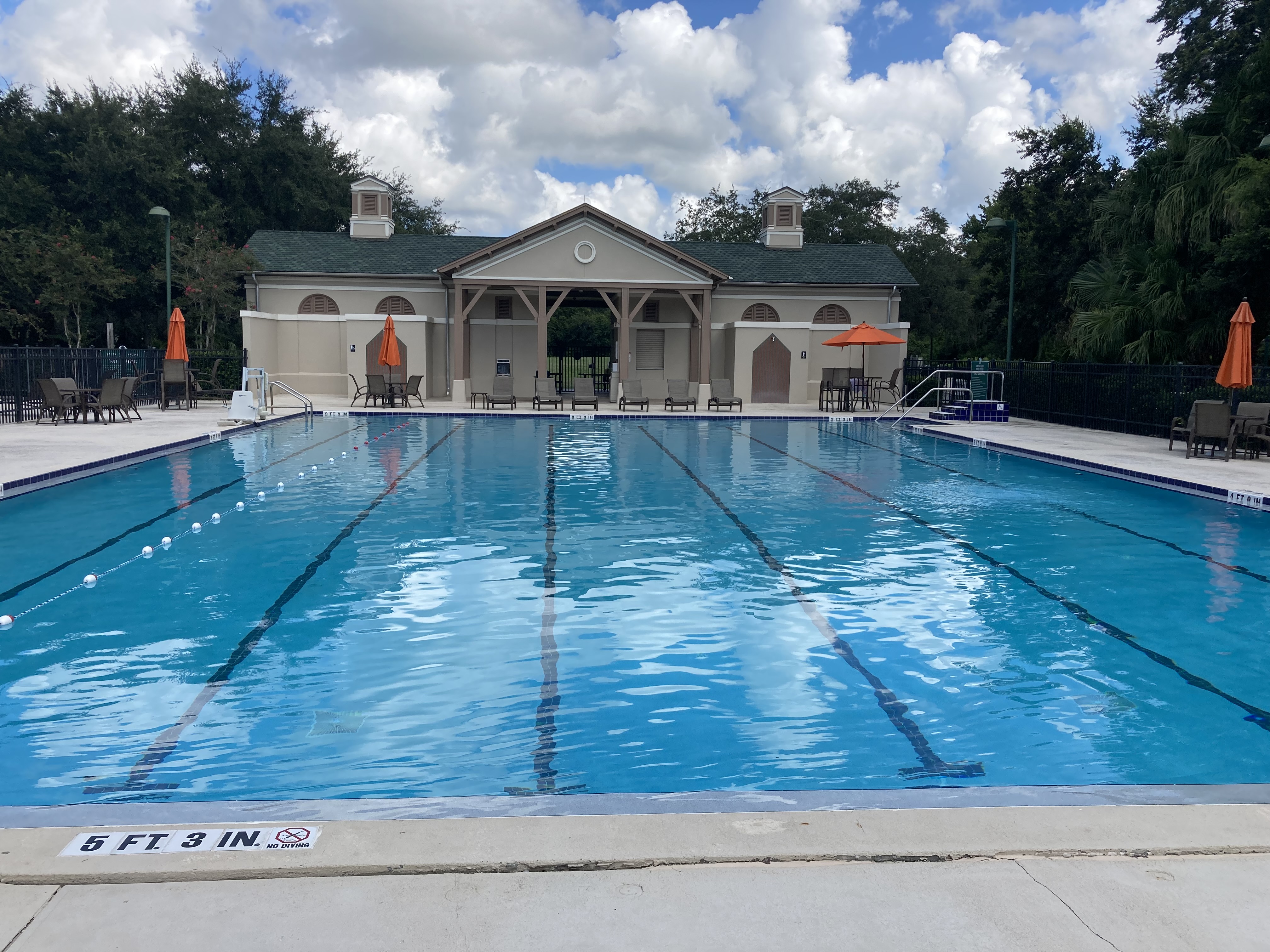 The pool is a 6 lane 25 meter heated pool with starting blocks on the far end. Located in the downown area of beautiful Celebration Florida.