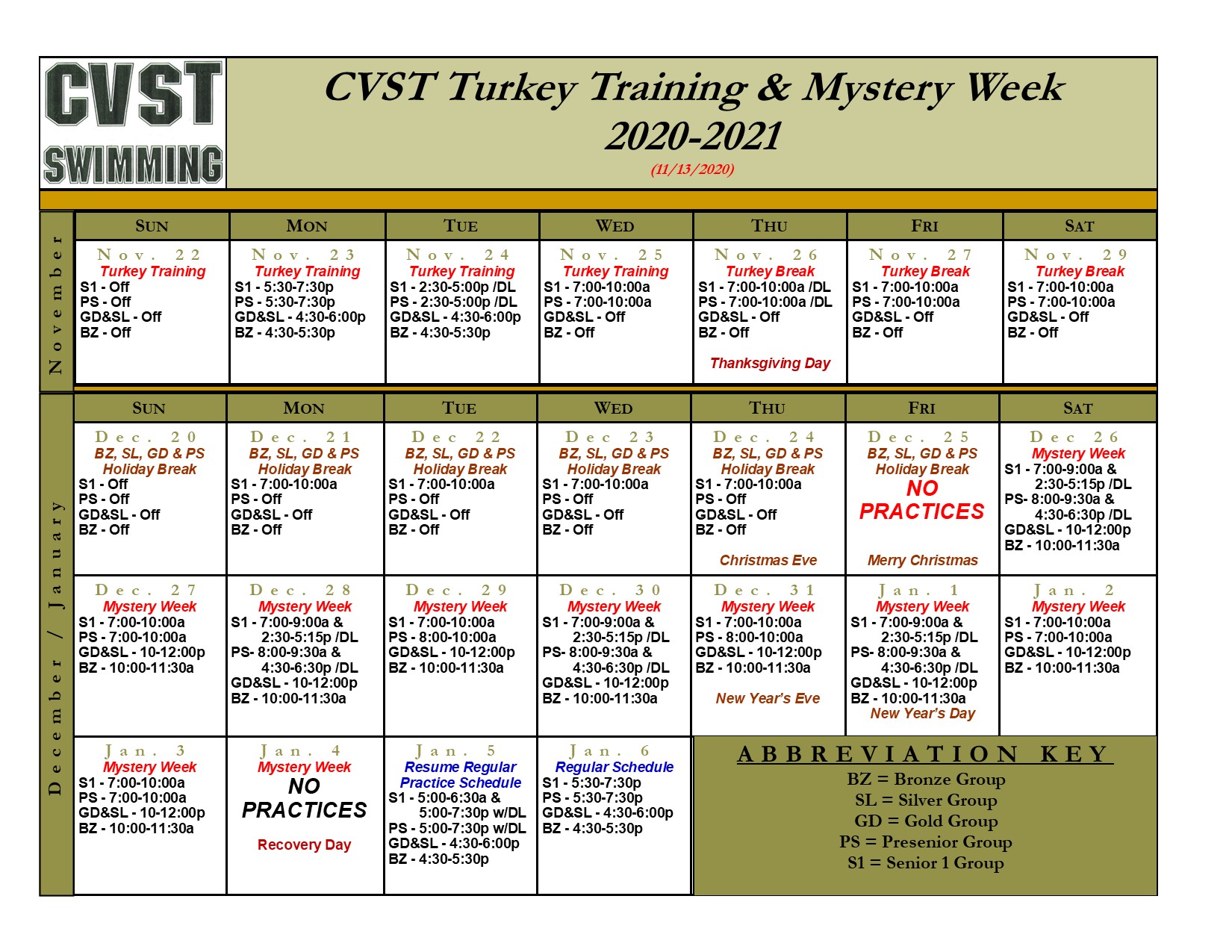 The Holiday Training Schedule runs November 21-29, for the Thanksgiving Holiday and December 18-January 4, 2023 for the Christmas/Winter Holiday.