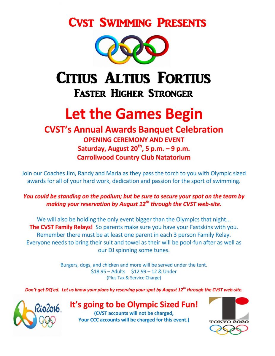 CVST's Annual Awards Banquet & Pool Party is being held Saturday, August 20, at the CCC Tennis & Aquatic Center. Reservations are mandatory and must be made through the CVST Website by Friday, August 12th. In order to be eligible for the annual team gift, you must be present. The Annula CVST Family Relays will also be taking place following the Dinnner & Awards Ceremony.