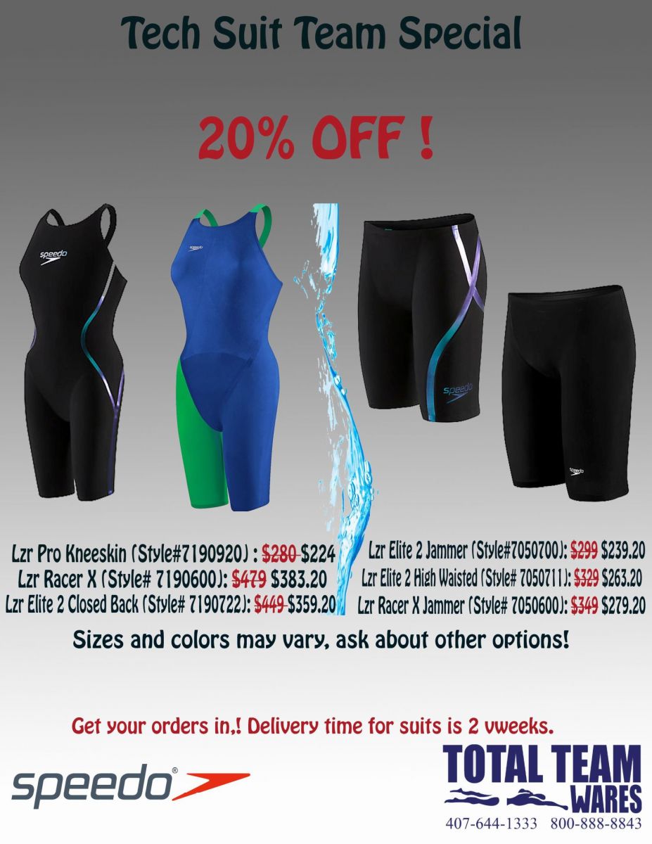 Total Team Wares is offering the 20% discount Special on Speedo Technical suits for Senior Champs, FLAGS and Area Swimmers. Senior Championship Swimmers must order by February 15th and FLAGS and Area Swimmers must order by February 22. Please call 407-644-1333 to place an order. We are open Monday thru Friday from 9-5.