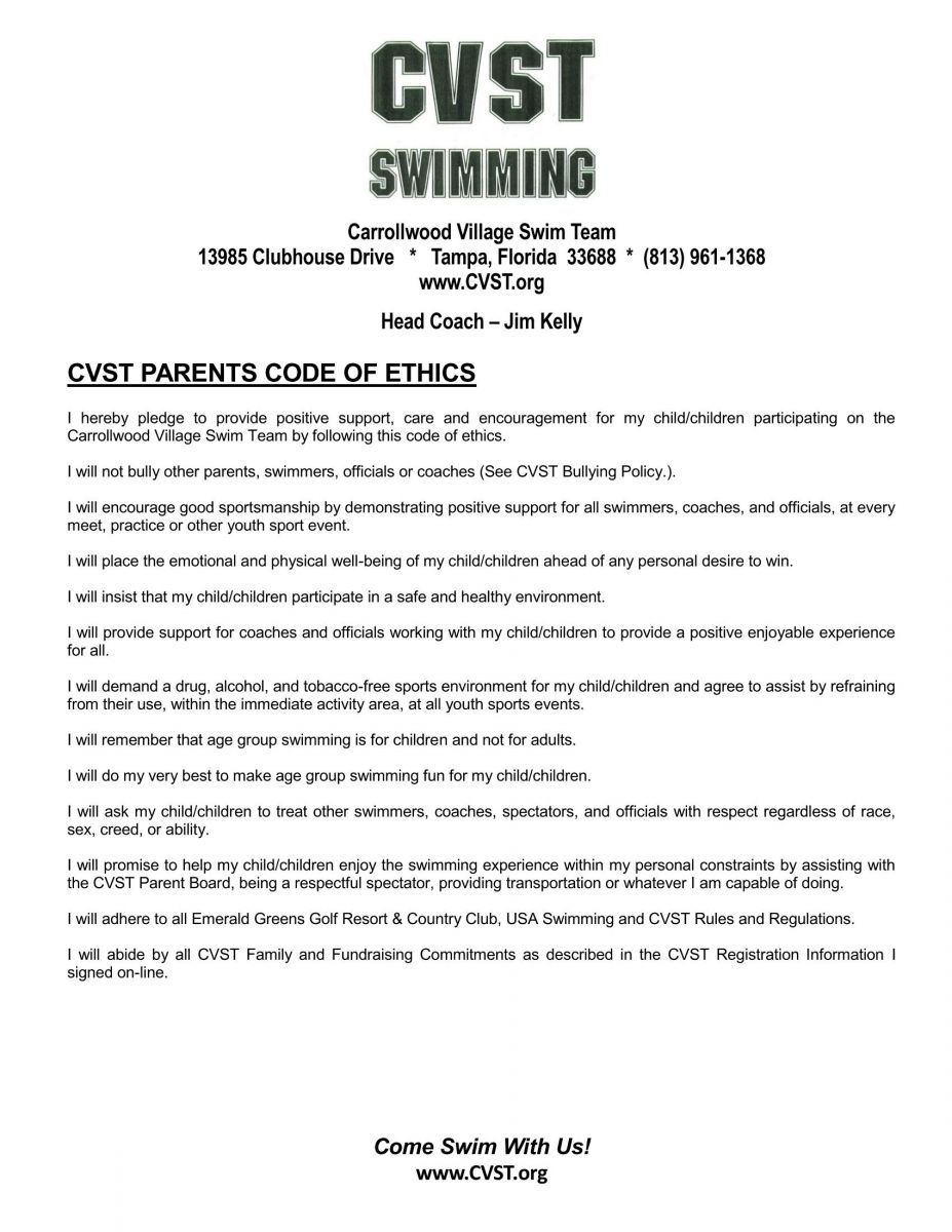 From the CVST Handbook - CVST Parents Code of Ethics
