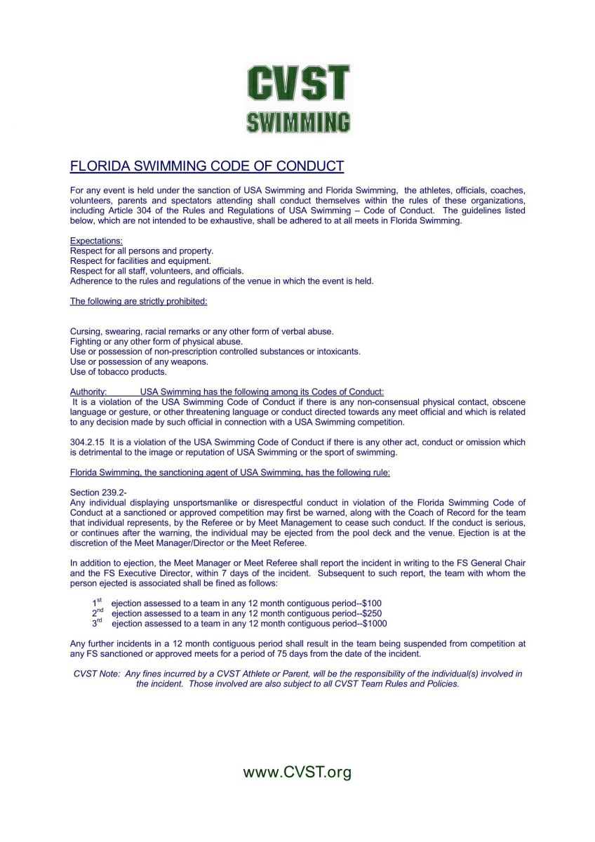 From the CVST Handbook - Florida Swimming Code of Conduct