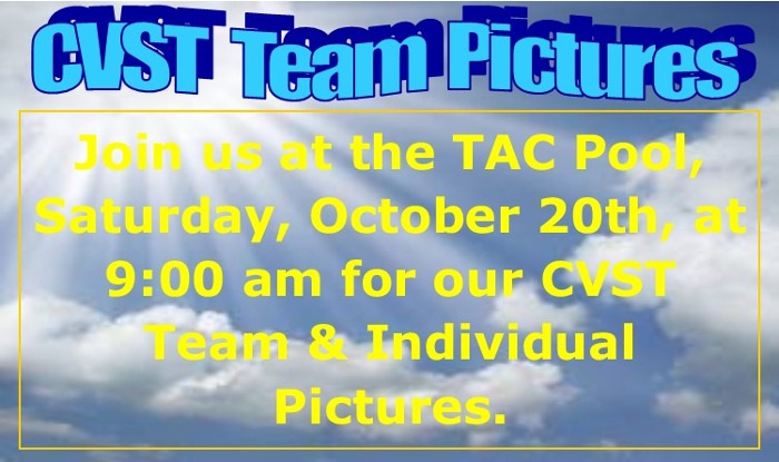 CVST Team Pictures will be held Saturday, October 20th, at 9:00am. Swimmers should wear their white CVST Swimming T-Shirt and their Team Swim Suit. The Group Picture will be taken first and then individual shots will follow. Below you will see the order form. You can follow the link provided below to pre-order or download the order form and bring it with you to the picture session.