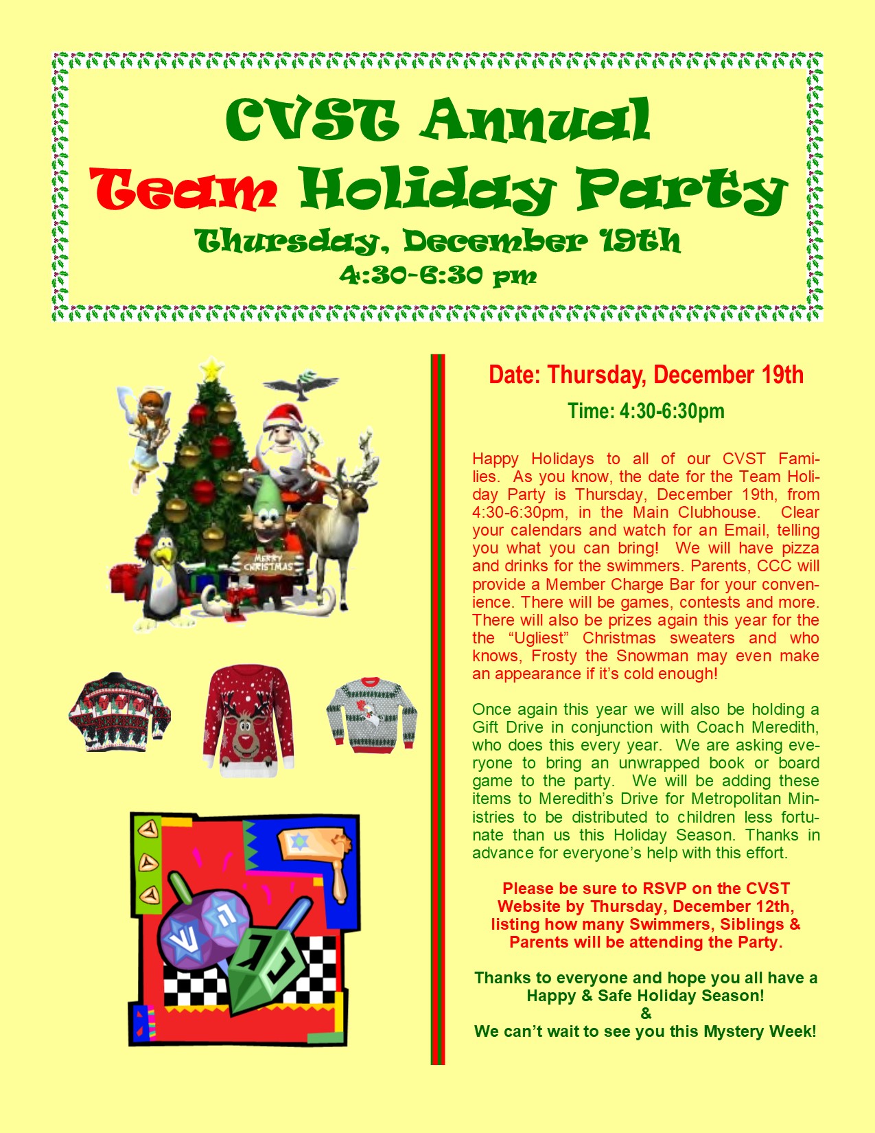 We will have our annual Holiday Party at the clubouse on Thursday, Dec 19th. The team will provide pizza but we need some volunteers to bring other items to fill in the rest. Click the link below to help out: