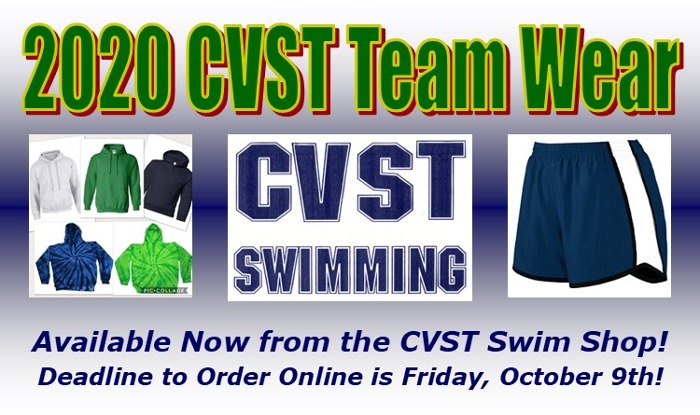 Today is the last chance to order your CVST Team Gear for the 2020-2021 swim season. We typically only place an order on clothing items once a year and the deadline for placing that order is today. All orders are due in by the end of the day, today, Friday, October 9th.