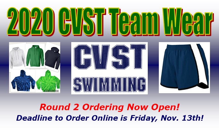 It's time for Round 2 of ordering our CVST Team Gear for the 2020-2021 swim season. We typically only place an order on clothing items once a year, but due to high demand, we are opening up for a second round, so place your order now, as it is your last chance. All orders are due by Friday, November 13th.