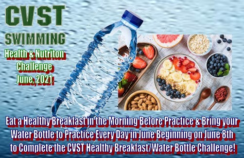 This month’s CVST Health and Nutrition Challenge will be to have a healthy breakfast each morning before practice and to have your water bottle with you at practice and drink 8 ounces of water during each practice.