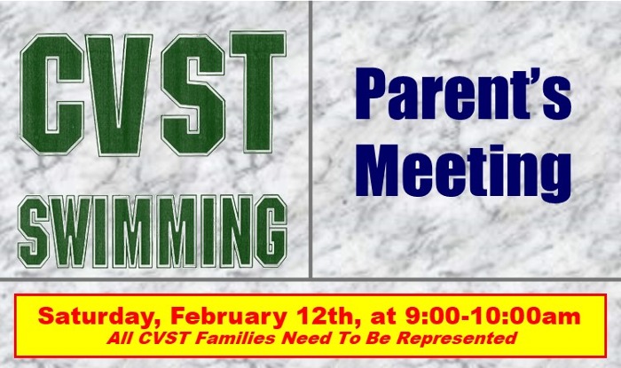 We will be holding a Mandatory CVST Parent Meeting during the Head Over Heels Flipturn Clinic, tomorrow, Saturday, February 12, from 9:00-10:00am. We ask that at least one parent from each CVST family is present. We will be goiing over upcoming meets, especially the Boys & Girls Club Nationals which we will be hosting in April and the required committments from our families and parents as well as other upcoming events.