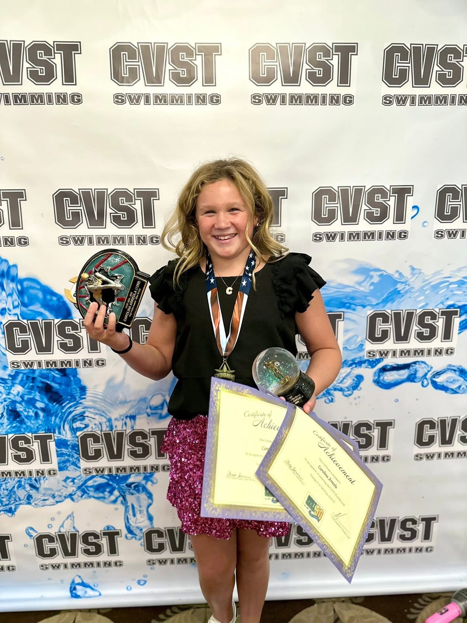 Carolina was given this honor at the CVST Annual Awards Banquet on August 17th. The Jim Kelly Award is a new award to the CVST program, instituted 3 years ago. The award is presented to a swimmer that exemplifies whom the Head Coach feels is a role model to the rest of the team for their achievements in the pool, along with their leadership and attitude outside of the pool. It is one of the team's highest honors and their name is placed on a perpetual plaque at the Jim Kelly Aquatic Center.