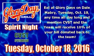 Show Your Support for CVST! Join us Tonight at Glory Days! Today's Practice Schedule Bronze Group - 4:30-5:30 pm Sliver & Gold - 4:30-6:00 pm Senior 1 & Senior 2 - 4:00-6:00 pm (Dryland 5:30-6:00 pm)