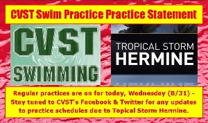 CVST Swim Practice Statement September 1, 2016 All CVST Swim Practices for the remainder of today, September 1st, have been cancelled due to the weather. Stay tuned to CVST’s Facebook & Twitter for any updates to practice schedules due to Topical Storm Hermine. CVST Twitter - www.twitter.com/CVSTSwimming CVST Facebook - www.facebook.com/CVSTSwimming August 31, 2016 Regular practices are on for today, Wednesday (8/31) - Stay tuned to CVST’s Facebook & Twitter for any updates to practice schedules due to Topical Storm Hermine. CVST Twitter...