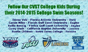 Follow CVST's College Swimmers This Season First posted 10/10/2014 The College swim season has begun and this is where you can follow our CVST College Swimmers and their progress throughout their seasons. Emma Volz (Sophomore) Florida Atlantic University Owls - Emma's Bio Page - Team Web Page - Meet Results Cassie Niles (Senior) Florida Gulf Coast University Eagles - Cassie's Bio Page - Team Web Page - Meet Results Kellie Roedig (Junior) Florida Gulf Coast University Eagles - Kellie's Bio Page - Team Web Page - Meet Results...