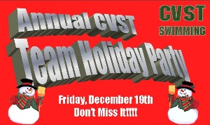 CVST Swimmer's Holiday Party DATE & TIME: 12/19/2014 (Fri 4:30PM - 8:00PM) LOCATION: CCC Pool The CVST Team Holiday Party is Friday, December 19, from 4:30-8:00 pm, after practice at the pool. Mary Kenny (Sean & Lauren's mom) is organizing the event and has emailed everyone, through Sign-up Genius, a sign some of the items that we will need. The team will be providing the pizza and drinks. However, if you could sign up to bring in any of the items on the Sign-up Genius list which was...