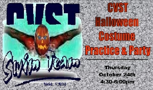 CVST Holds Annual Halloween Costume Practice CVST once again held their Annual Halloween Costume Practice in October and the costumes were a hit as always. The catch to this event is that all of the swimmers need to wear a costume to practice that they can swim in and were they ornate and original this year. The costumes ranged from the Queen of Hearts to Hunger Games Characters and from Olympic Athletes to our very own Coach Jim. To see some pictures from the event, Click Here.