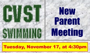 CVST New Parent Meeting - Tuesday, November 17, at 4:30pm CVST will be holding a New Parent Meeting, on Tuesday, November 17th, at 4:30pm, during the Bronze, Silver & Gold Practices. This will be a short meeting to introduce our new families to some of the rules, traditions and happenings that come along with being a part of the CVST family. if you are new to the team, or if you just have some questions, please be sure to make plans to attend the meeting. We look forward to seeing...