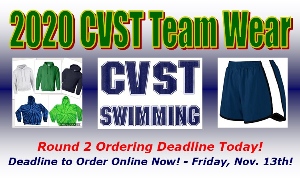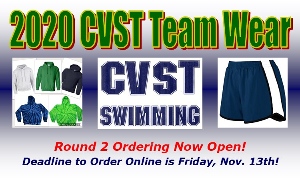 Round 2 of Ordering CVST Team Gear Open Until Nov. 13th It's time for Round 2 of ordering our CVST Team Gear for the 2020-2021 swim season. We typically only place an order on clothing items once a year, but due to high demand, we are opening up for a second round, so place your order now, as it is your last chance. All orders are due by Friday, November 13th. Click the link below to place your electronic order. If you need to order multiples of items please place...