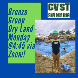 Special Bronze Group Dryland Team Time On Monday Do you have, or are you a #CVST Bronze Grouper with endless energy? Well then you will want to Log In to Monday's Bronze Team Time Meeting at 4:45pm! We will be doing a special Live Dryland Program with Maria! All that’s required is a towel or mat and a place to put up your camera for the workout! Be sure to be on the Team Time Zoom Meeting for a great workout and even a little bit of fun! See you...