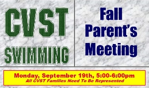 REMINDER: CVST Fall Parent Meeting Tonight - 5:00pm We will be holding our CVST Fall Parent Meeting on tonight, Monday, September 19, from 5:00-6:00pm. We ask that at least one parent from each CVST family is present. We will be goiing over USA Swimming Registration, upcoming CVST hosted meets, and the required committments from our families and parents as well as other upcoming events, Officiating and more. If you have any questions, please see Coach Jim.