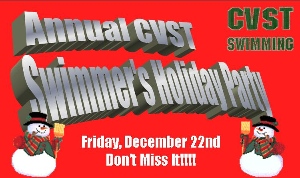 CVST Team Holiday Party - Sign-up Extended One Day As of last night only 40 people, Swimmers and Parents combined, had signed up for the CVST Holiday Party. We are extending the Sign-up Deadline one more day through today, so please, if you have not signed up, go to the Event Page of the website and sign-up today. Click Here for Link to Sign-up Genius to bring some goodies needed for the Party. Click Here to Download Flyer