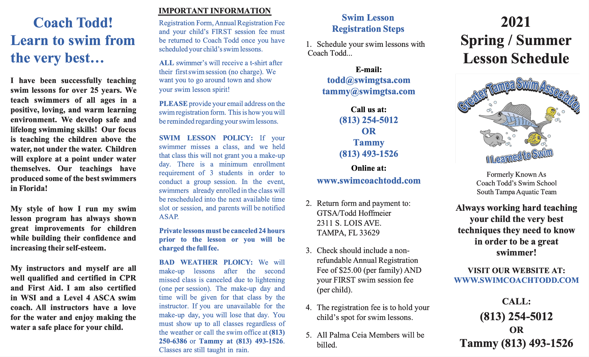 You can now register your child/children for our 2021 Spring & Summer Swim Lessons. We look forward to working with yor child/children soon! (Feel free to click on the brochure to make it larger.)