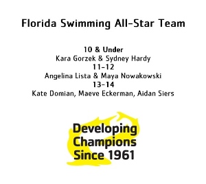 Seven Sarasota Sharks' age-groupers; Kara Gorzek, Sydney Hardy (10U); Angelina Lista, Maya Nowakowski (11-12); Kate Domain, Maeve Eckerman, Adian Siers (13-14); have been selected to Florida ALL STARS to compete against the Florida Gold Coast All-Star Team Mar 26-28th. LOCATION: Indian River State College, Ft. Pierce SELECTION PROCEDURES: - The Florida All-Star Team will be selected from the COMBINED results of the 2021 Florida Swimming Age Groups Championships North and South. - Swimmers who finish in the Top 6 of the COMBINED results in any individual event (10&u- Timed Finals,...